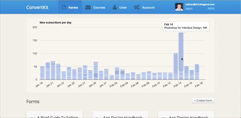 In June 2013 we added basic list functionality (the subscribers in a group of forms) and the ability to send broadcasts to them. Around this time I was able to start to fully move from MailChimp to ConvertKit for everything.