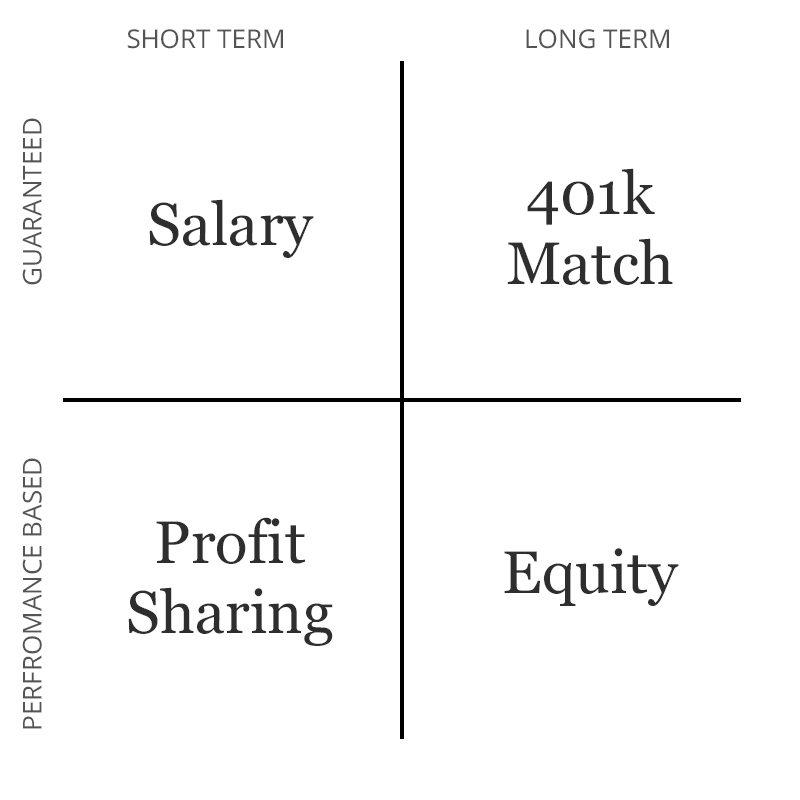 I think of compensation in two categories: short vs long-term and guaranteed vs performance based.