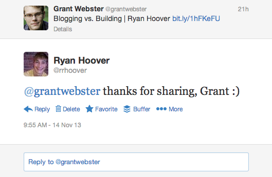 Ryan’s method is to search Twitter for the URL of any blog posts he’s published, then reply to anyone who tweets it out and say “Thanks!”